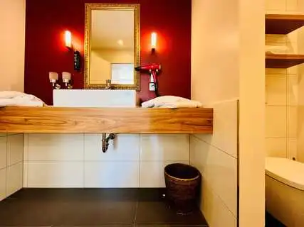 Enjoy the cosy comfort of our ‘Deluxe’ 1 bedroom apartment on 50 sqm. The ‘Deluxe’ apartment offers you a separate bedroom with a 1.80 metre wide double bed and LCD satellite TV, work area and air conditioning. The living room has a cosy living area with LCD satellite TV, fully equipped open-plan kitchen corner and large dining table. The bathroom also invites you to relax with its rain shower. Some apartments have a walk-in wardrobe and a sofa bed.