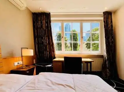 The skilfully furnished single studios offer you everything you need for your stay on 20 sqm. They are furnished with a 1.40 metre wide single bed, a work and dining area and a fully equipped kitchenette. The bathroom has a shower.