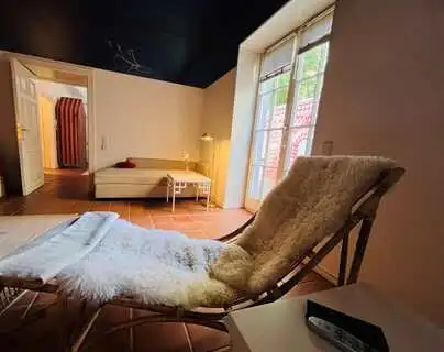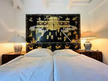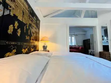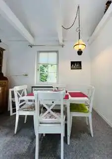 The former coach house offers you plenty of comfort and absolute privacy on 2 levels totalling 120 sqm. The original half-timbered house from 1910 has been renovated with great attention to detail and designed in an Asian lifestyle. On the ground floor you will find your own sauna, terrace, lounger and 2 sofa beds, which can be converted into a large sofa bed. There is a separate shower right next to the sauna. On the ground floor there is also a separate toilet and your own washing machine and tumble dryer. A spiral staircase takes you up to the second floor to your large, fully equipped eat-in kitchen with oven, dishwasher and dining area. The adjoining cosy living room with decorative fireplace invites you to linger. From here you enter the bedroom with a 1.80 m wide double bed and adjoining walk-in wardrobe. The bathroom is accessible from the bedroom. The coach house has its own free WLAN. A car park can be booked free of charge if required.